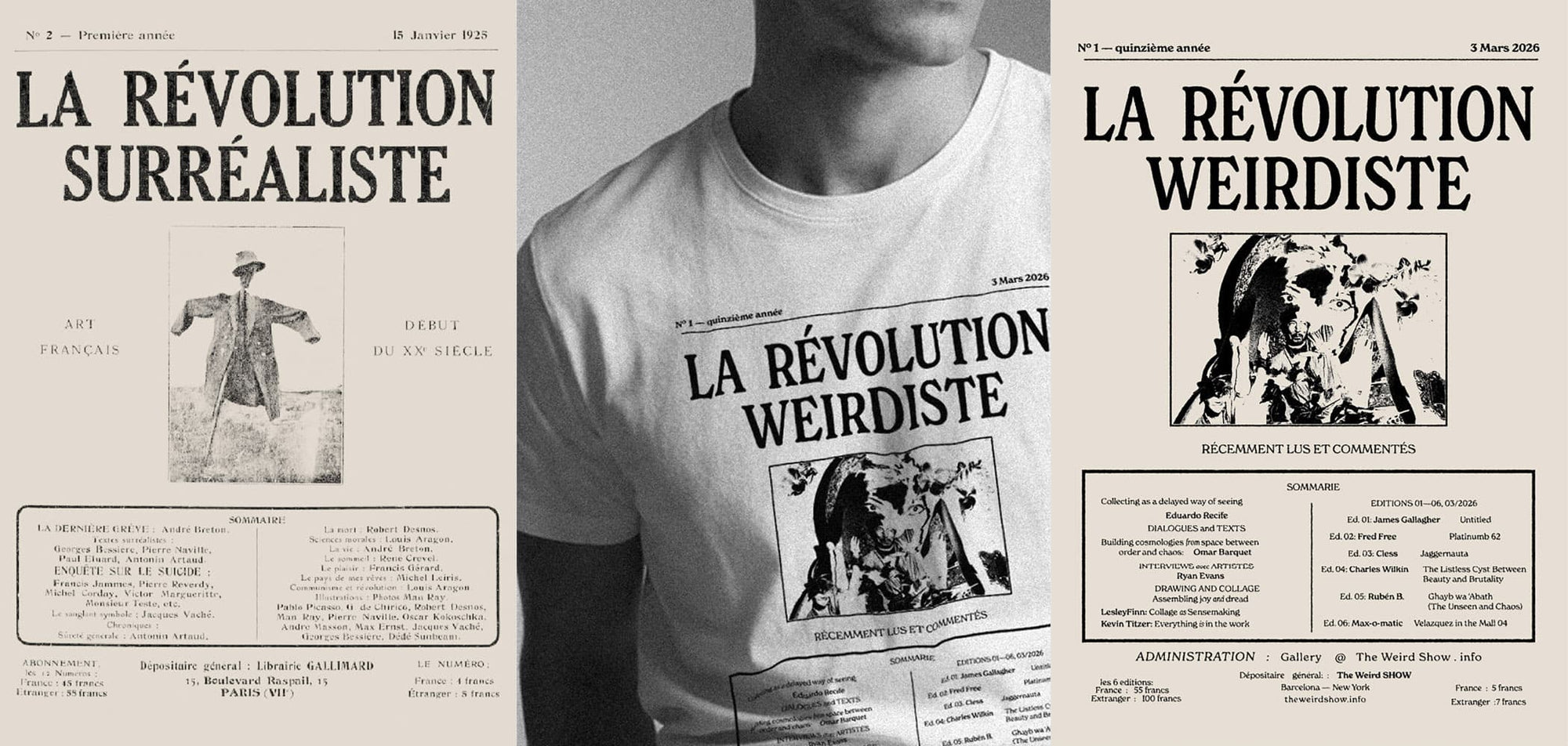 This t-shirt is an adaptation of the cover of La Révolution Surréaliste, the Surrealist movement's founding publication from 1924. The nod is intentional: the Surrealists were the original weirdos — artists who decided the world as it was made no sense and that art needed to respond to that. A position we recognize.
